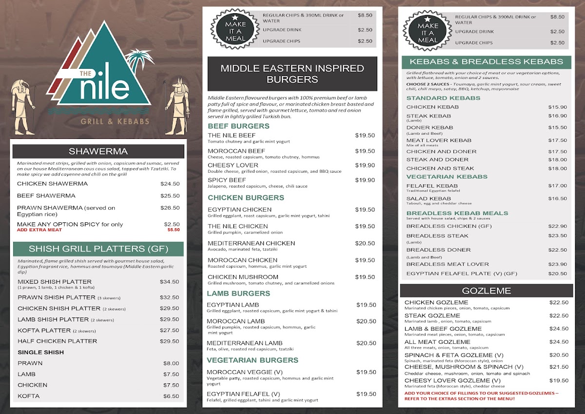 Welcome to The Nile Grill and Kebabs, a delightful Middle Eastern eatery located in Eaton, WA, where authentic flavors reign supreme. The menu showcases a tantalizing array of kebabs, perfect for both meat lovers and vegetarians. Indulge in their signature Breadless Steak Kebab and Marinated Chicken Kebab, served with a vibrant, Sweet Chilli & Lime Dressed Gourmet House Salad and crispy Nile Chips.